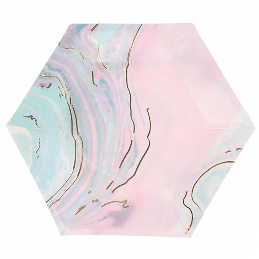 Набір паперових шестикутніх тарілок з мармуровим принтом відмінно підійде для сервірування святкового столу!