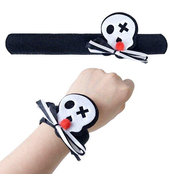 Слеп-браслет чорного кольору з об'ємним декором у вигляді черепа. Завдяки тому, що в основі гнучка пластина, яка самозамикається, аксесуар обгортається навколо зап'ястя, надійно фіксуючись на руці. Яскравий браслет-іграшка відмінно підійде для доповнення образу або в якості сувеніра на тематичну вечірку та свято Хелловін.